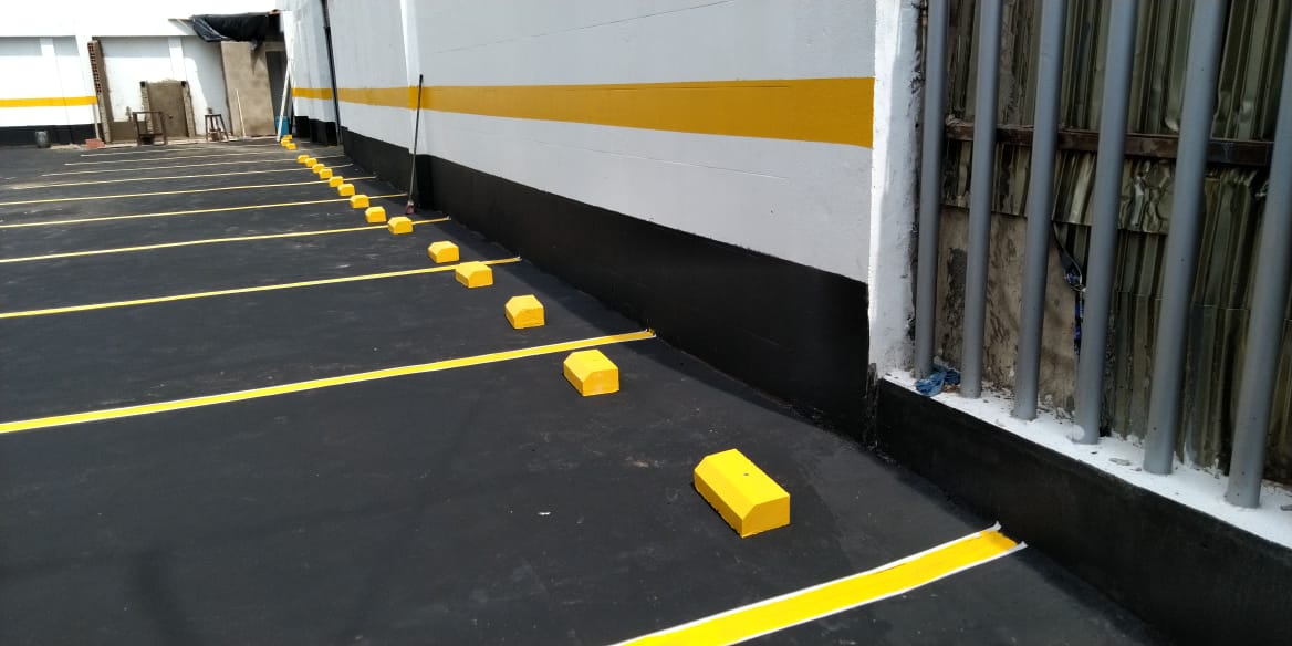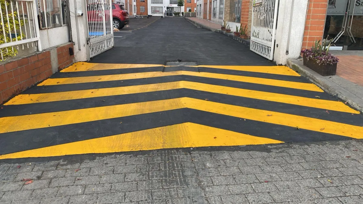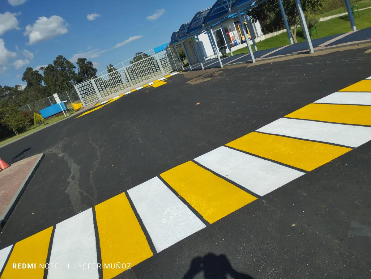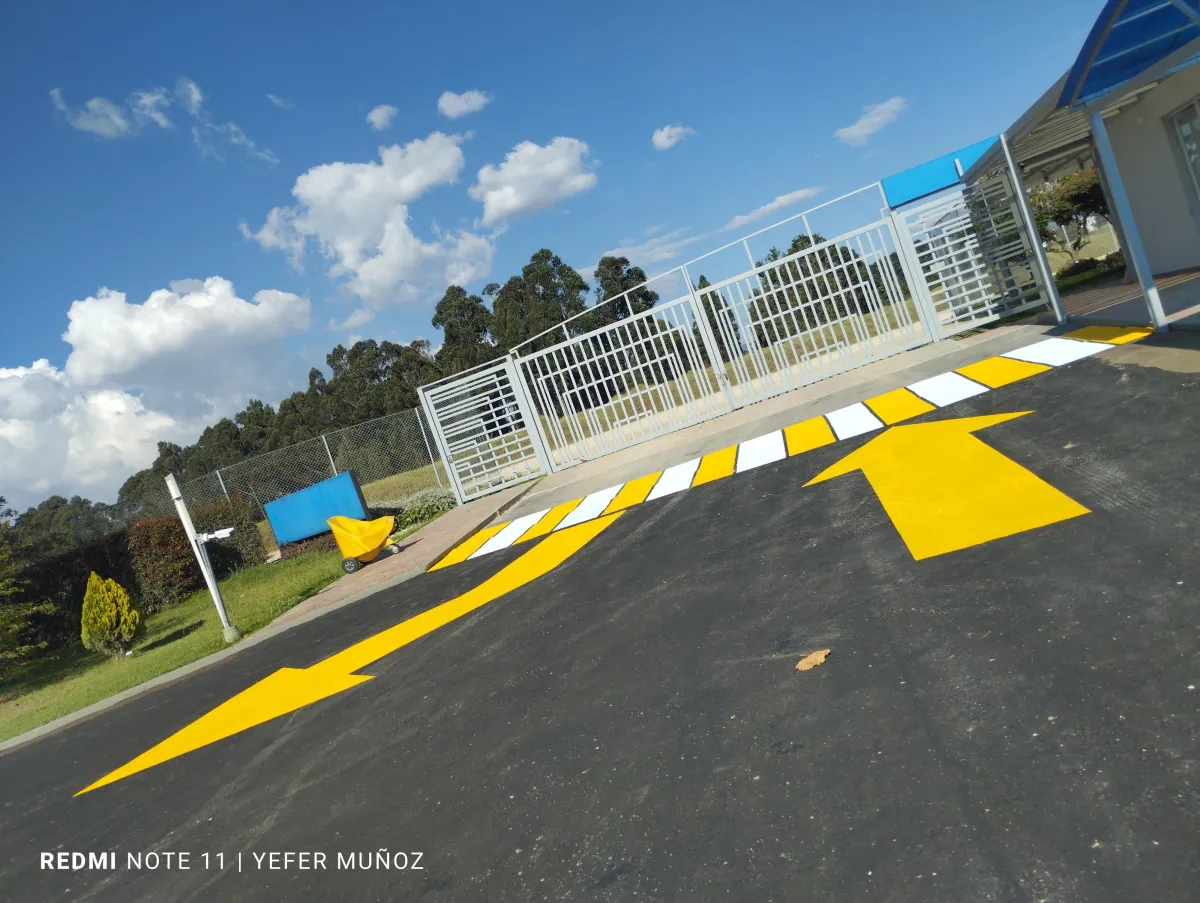 Demarcación Vial (Pintura): Uso de pintura de alto tráfico, blanca o amarilla, para delimitar celdas, zonas peatonales (cebras), flechas de sentido de circulación y áreas de no parqueo.